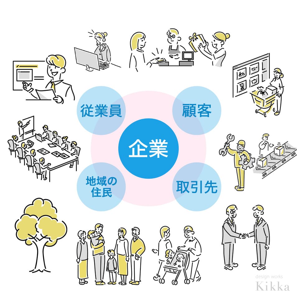 株主・経営者・従業員・顧客・取引先(金融機関を含む)・競合企業、行政機関やNGO、NPO、地域社会なども該当します。さまざまな立場の人物や組織・団体を示す単語であり、多くの場合、幅広い範囲が対象です。